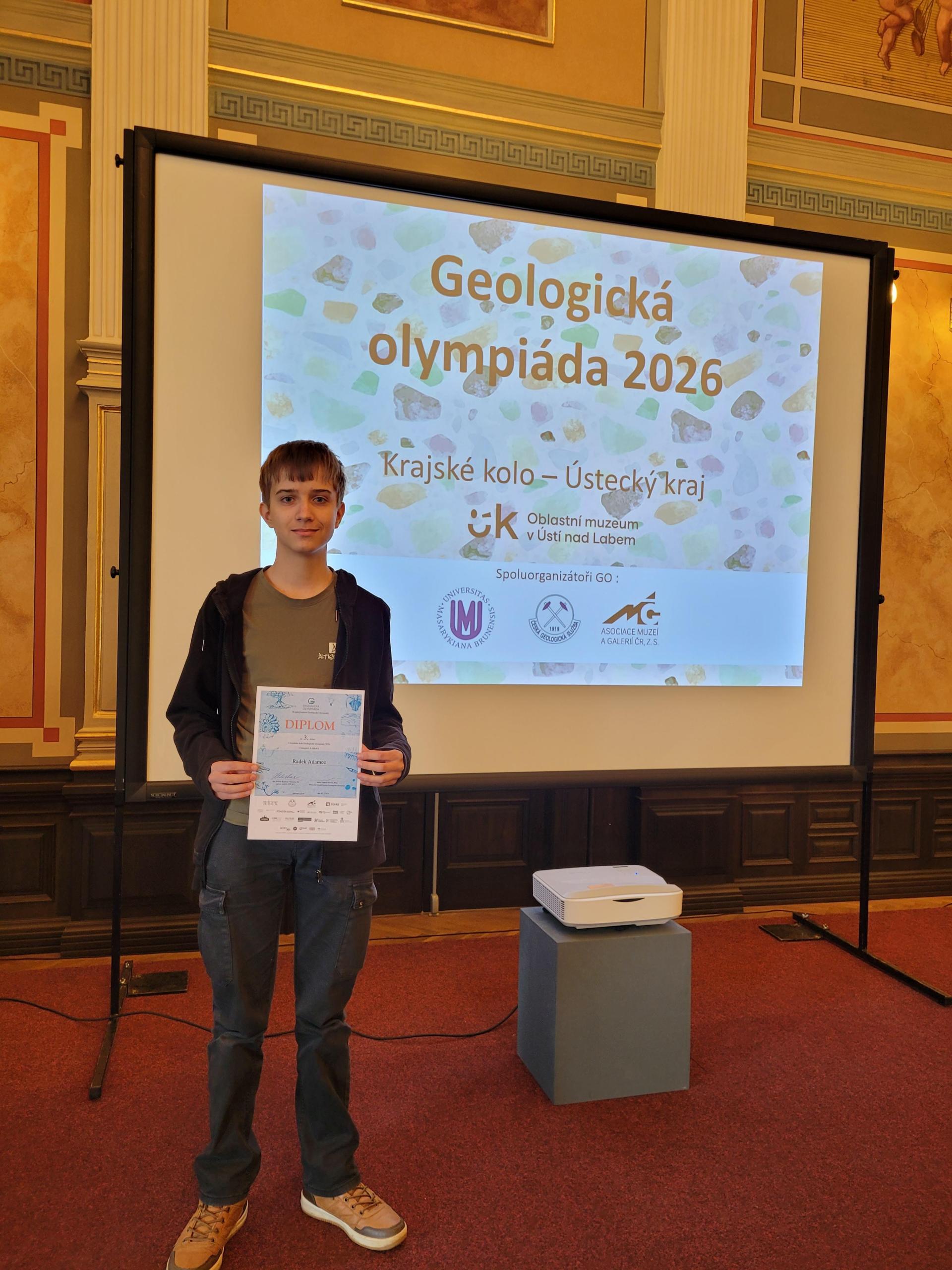 Radek Adamec žák 4. A8 se umístil na 3. místě v krajském kole geologické olympiády. Gratulujeme.